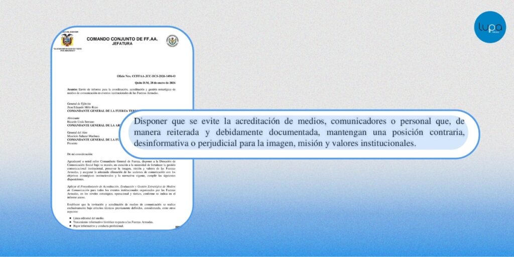 La matriz califica a los periodistas como “aptos”, “aptos condicionados” o “no aptos”, y recomienda evitar la acreditación de quienes sean considerados perjudiciales para la imagen institucional. Tras la publicación del documento por Ecuavisa, las Fuerzas Armadas señalaron que se trataba de un mecanismo organizativo y no de una limitación al trabajo periodístico.