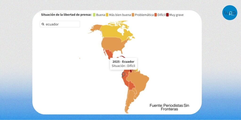 Fundamedios registró 103 afectaciones al acceso a la información entre 2022 y 2026. A nivel regional, RSF alerta que la concentración de medios, la precariedad laboral y la crisis económica debilitan la independencia editorial, facilitando la desinformación cuando el periodismo pierde capacidad de fiscalización.