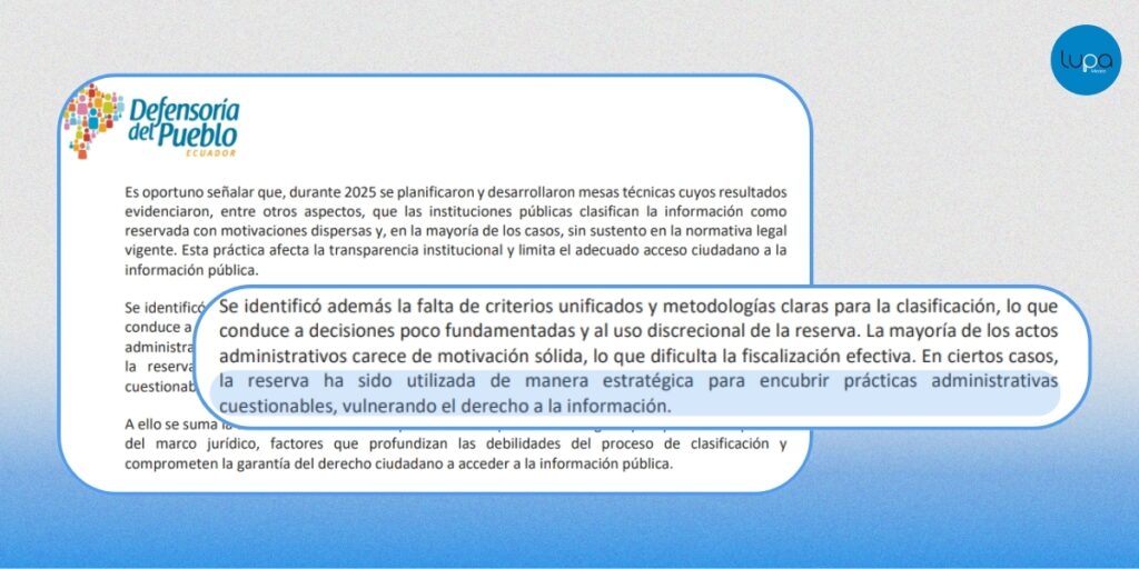 La Defensoría también señaló dos observaciones. La primera, sobre la calidad de la información entregada, especialmente por los Gobiernos Autónomos Descentralizados. La segunda, sobre la falta de criterios claros y metodologías unificadas para declarar información como reservada, lo que ha derivado en decisiones poco fundamentadas. En algunos casos, advirtió, la reserva se ha utilizado de forma estratégica para evitar el escrutinio público.