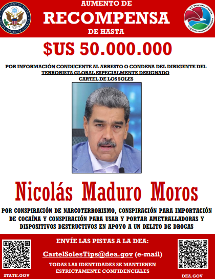 Departamento de Estado de EE. UU. – Reward Offer Increase of Up to $50 Million for Information Leading to Arrest and/or Conviction of Nicolás Maduro 07/08/2025