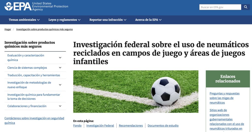 Los análisis del plan federal estadounidense “Investigación federal sobre el uso de neumáticos reciclados en campos de juego y áreas de juegos infantiles” elaborado por la Agencia de Protección Ambiental de Estados Unidos, detectaron la presencia de metales, compuestos orgánicos volátiles e hidrocarburos en el caucho granulado, pero determinaron que la cantidad que realmente se libera al aire o entra en contacto con el cuerpo no alcanza niveles preocupantes.