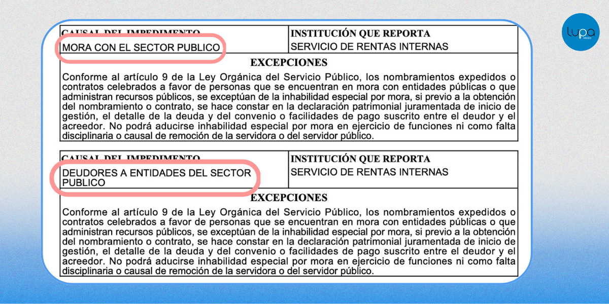 La mañana del 10 de febrero, Lupa Media verificó que en la plataforma del Ministerio de Trabajo constaban dos causales de impedimento: “mora con el sector público” y “deudas a entidades del sector público”.