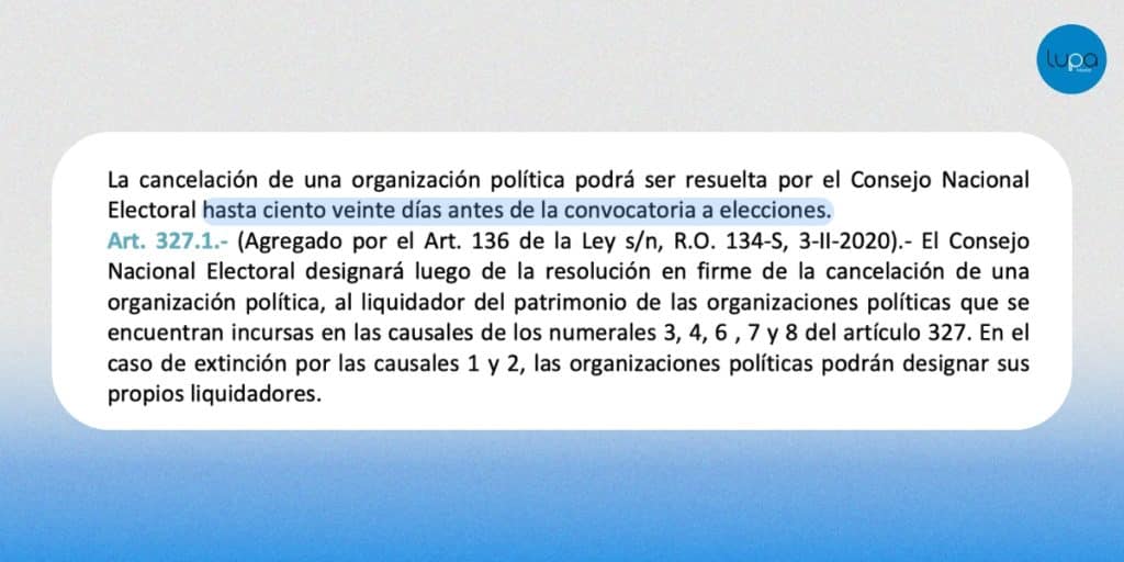 El artículo 327 del Código de la Democracia establece que la cancelación de organizaciones políticas puede realizarse hasta 120 días antes de la convocatoria a elecciones.