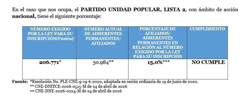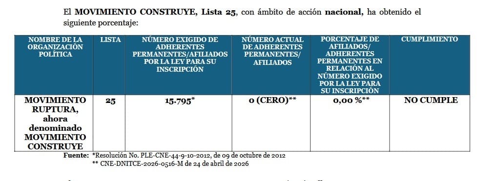 El Consejo Nacional Electoral (CNE) resolvió el 26 de abril de 2026 cancelar las organizaciones políticas Construye y Unidad Popular. La decisión se basa en el incumplimiento del número mínimo de afiliados exigido por la ley para mantener su personería jurídica.