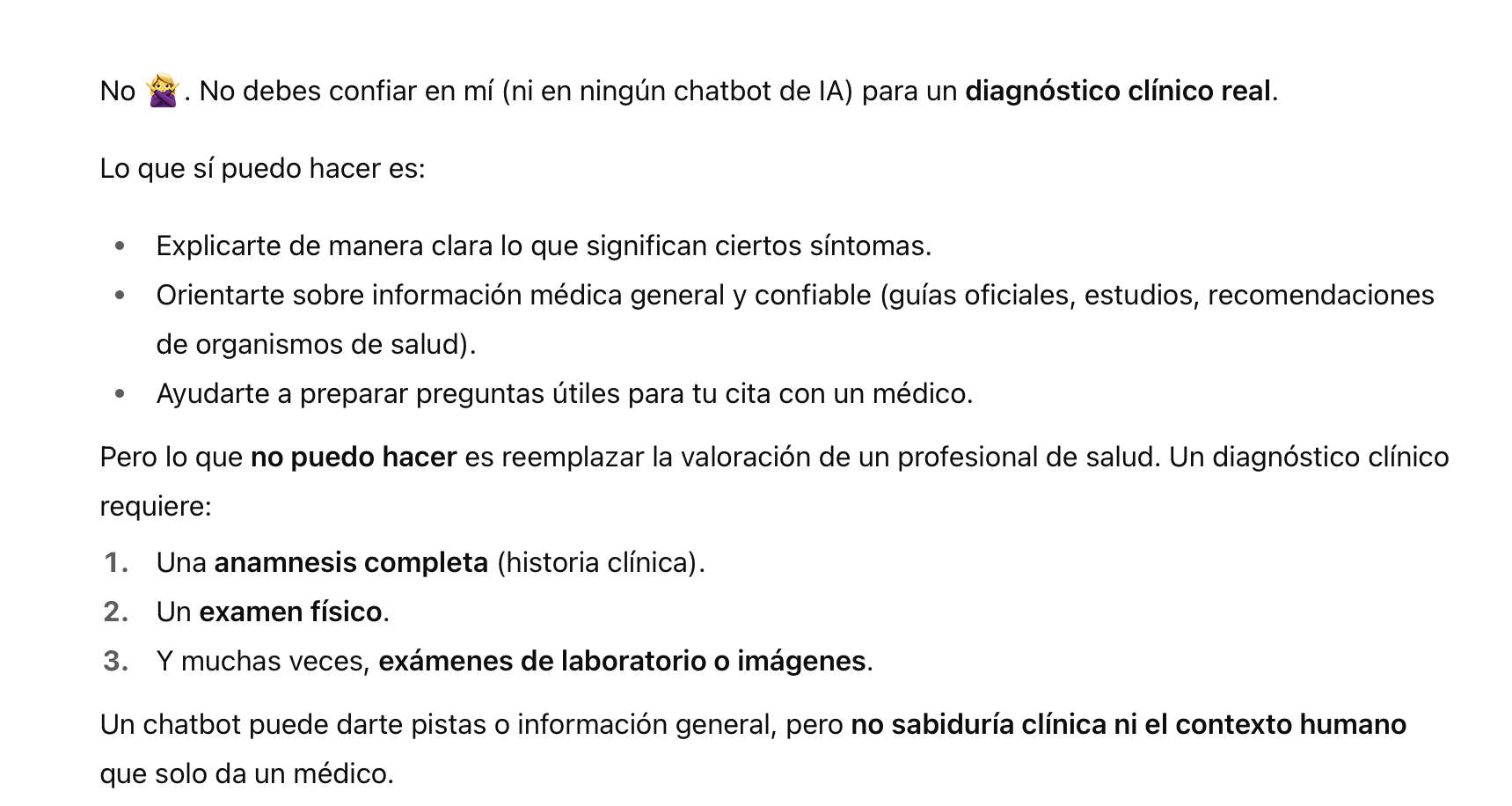 Consultamos a uno de los chatbots más usados en el mundo. Chat GPT si podemos confiar en un diagnóstico clínico y esta fue su respuesta: