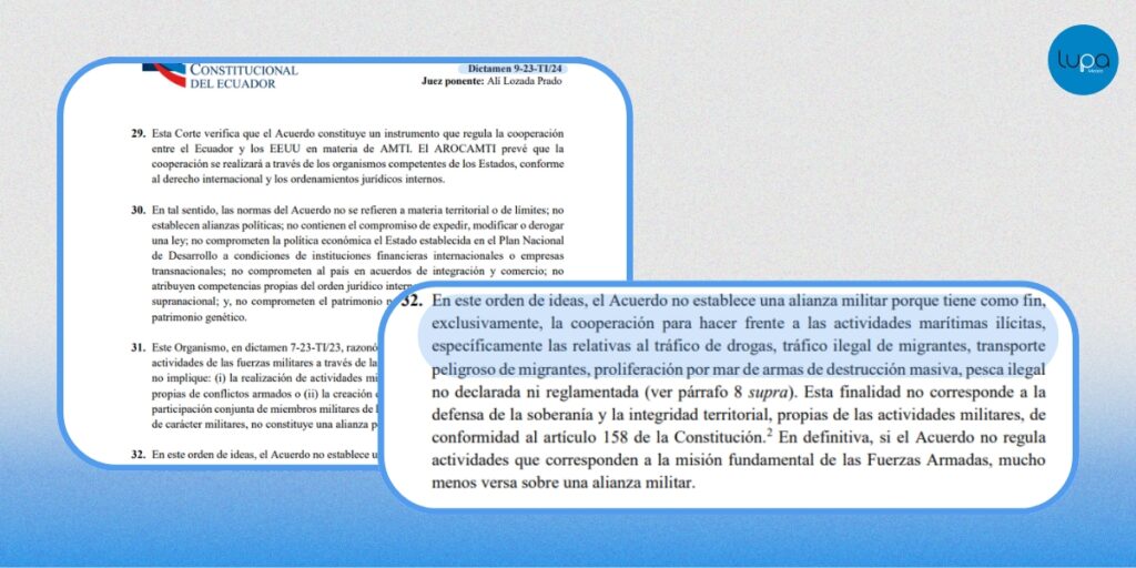 La Corte Constitucional, en su dictamen del 11 de enero del 2024, precisó que estos acuerdos no constituyen una alianza militar ni implican acciones bélicas, sino cooperación en seguridad y control del crimen organizado.