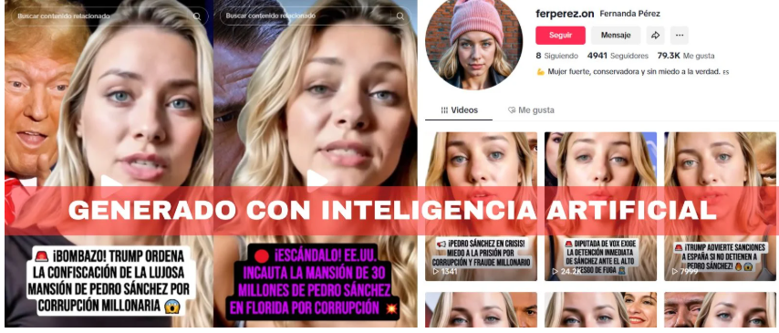 Otra estrategia de desinformación, basada en un avatar y noticias falsas, se aplicó en España. En este caso, no se utilizó el perfil de un periodista, sino el de una “mujer”. Maldita.es detectó dos vídeos, publicados en marzo de 2025 en dos perfiles de TikTok diferentes, que amplifican desinformación sobre supuestos casos de corrupción destapados en EEUU que afectarían a Sánchez y su Gobierno.