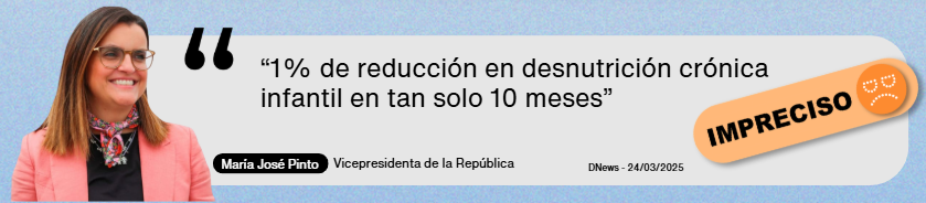 Aunque la desnutrición crónica infantil a nivel nacional disminuyó en el ciclo 2023-2024 en comparación con 2022-2023, la reducción en menores de dos años fue exactamente del 0,8%. Además, es importante precisar que el periodo de estudio abarcó de julio de 2023 a agosto de 2024, por lo que la reducción no ocurrió únicamente en 10 meses, ni tampoco esto corresponde al periodo de gestión de Daniel Noboa.