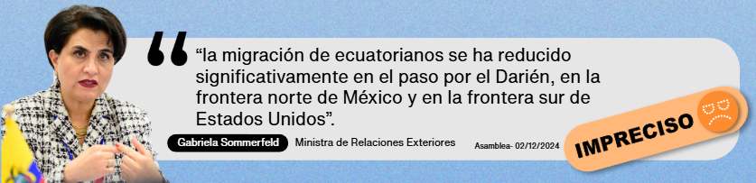 Para finales de 2024, se registró una reducción en el número de migrantes ecuatorianos que cruzaban el Darién y que habían sido encontrados por la patrulla fronteriza en Estados Unidos durante ese año, peo eso no significa que los ecuatorianos hayan dejado de salir del país. Un informe de la ONU Migración Ecuador, publicado en agosto de 2024, reveló que la ruta del Darién dejó de ser la principal vía utilizada por los ecuatorianos para migrar a Estados Unidos. Además, en la frontera norte de México, la migración irregular de ecuatorianos creció un 23% hasta agosto de 2024 en comparación con el mismo periodo de 2023.