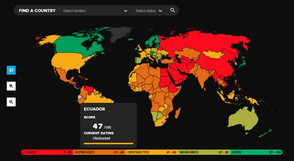 Ecuador se encuentra actualmente en la categoría “obstruido”, lo que refleja un escenario donde existen derechos formales, pero su ejercicio enfrenta limitaciones significativas.