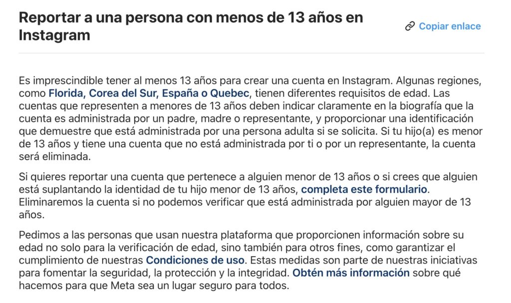 La mayoría de plataformas establece 13 años como edad mínima, entre ellas TikTok, Instagram, Facebook, YouTube y Snapchat. Todas las plataformas señaladas indican que el mínimo de ingreso para sus redes es de 13 años. Incluso cuentan con términos para el uso de menores de edad. En algunas regiones del mundo como Florida y Corea del Sur, Instagram permite que una cuenta sea de un menor de esa edad; solo si se aclara en la biografía que la cuenta es manejada por un padre, madre o representante.