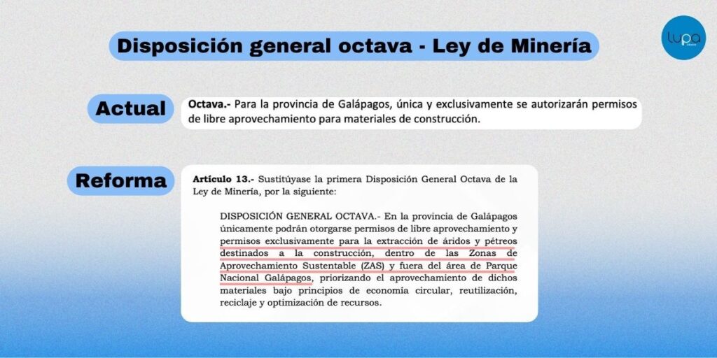 Además, esta extracción solo podrá hacerse dentro de Zonas de Aprovechamiento Sustentable y siempre fuera del Parque Nacional Galápagos. En la práctica, se mantiene la prohibición de minería a gran escala, pero se permite la obtención controlada de materiales básicos únicamente destinados para construcción.
