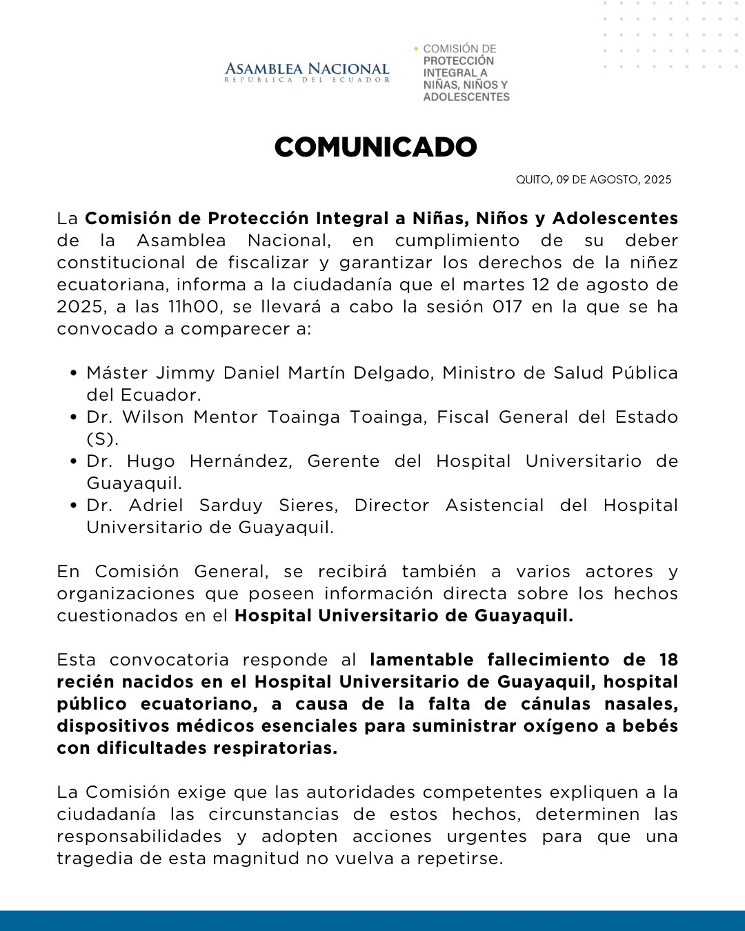 A raíz de la versión sobre los presuntos 18 fallecimientos por falta de cánulas, la asambleísta Viviana Veloz, presidenta de la Comisión de la Niñez, solicitó la comparecencia del ministro de Salud Pública, del fiscal general del Estado y de otros actores clave, con el fin de conocer a fondo las causas de las muertes.