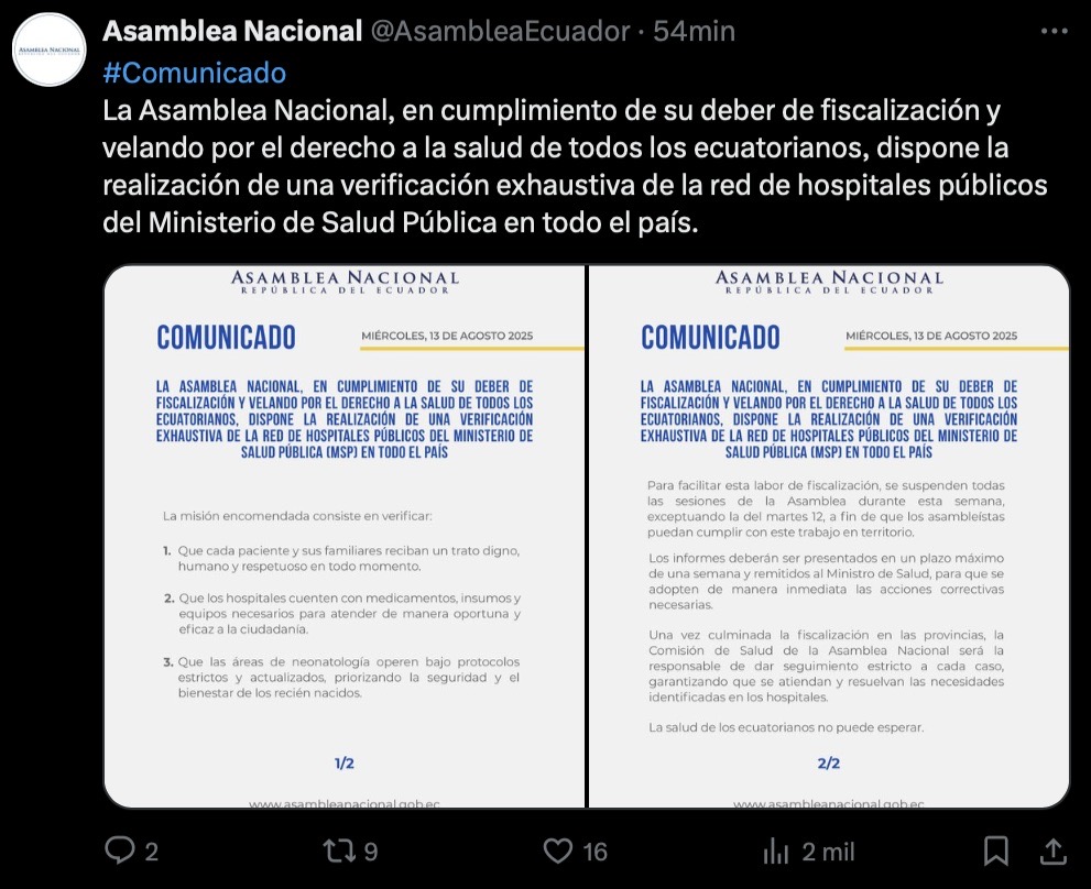 El 13 de agosto, la Asamblea Nacional emitió un comunicado informando que la Comisión de Salud dará seguimiento al caso, sin embargo, esa publicación fue eliminada minutos después. Ese mismo día la Comisión de la Niñez resolvió iniciar formalmente un proceso de fiscalización sobre el caso, con 7 votos a favor. La presidenta, Viviana Veloz, anunció que el 15 de agosto se realizará una sesión en territorio, en Guayaquil, para recopilar testimonios y evidencias.