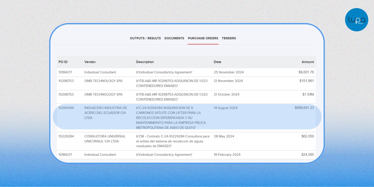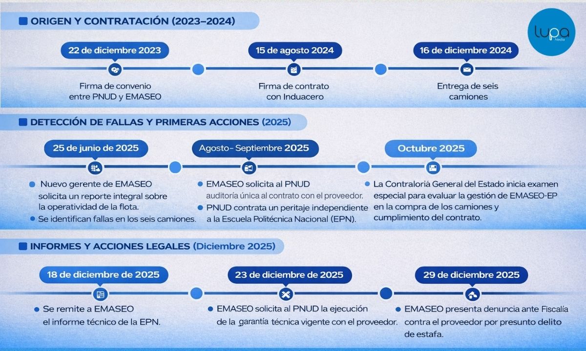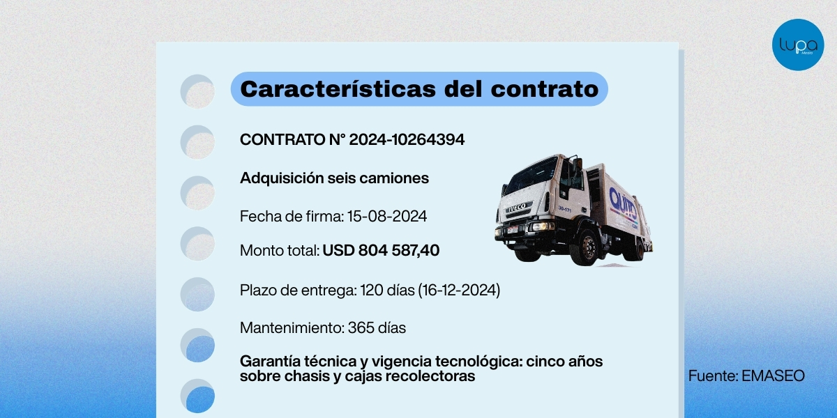 El contrato fue firmado en agosto de 2024 con la empresa Industria de Acero del Ecuador (Induacero) por un monto total de USD 5,4 millones, que incluyó seis camiones recolectores tipo satélite, 1.000 contenedores y otros equipos. De ese total, aproximadamente USD 804.000 correspondieron a los camiones. La entrega se concretó en diciembre de 2024.