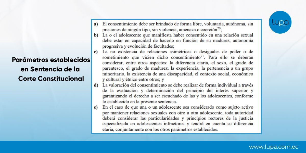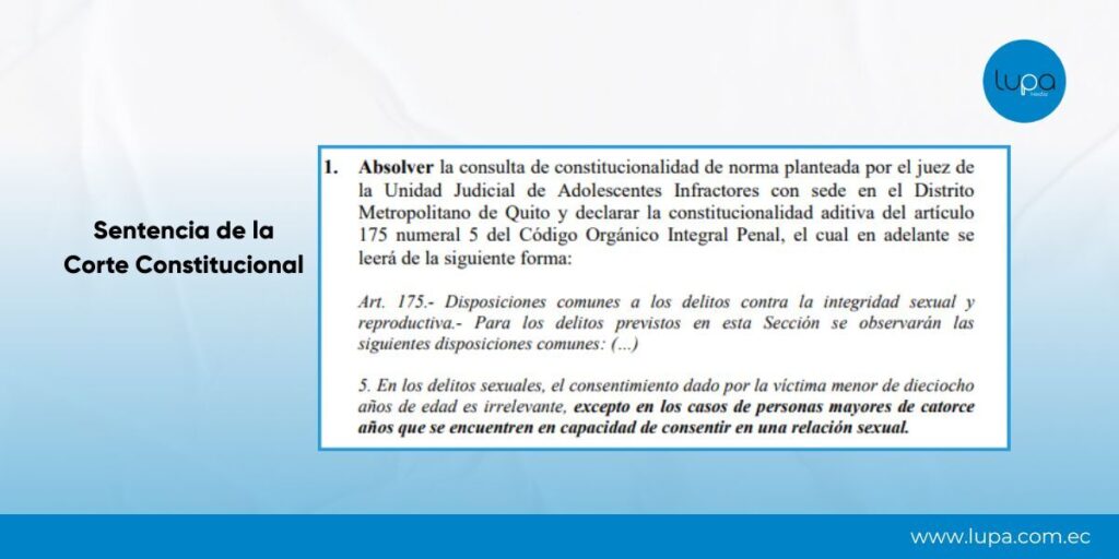 En diciembre de 2021, la Corte Constitucional resolvió un caso en el que una adolescente menor de 14 años tuvo relaciones con su pareja de 17 años. Analizó el artículo 175 numeral 5 del COIP, que antes indicaba que “en los delitos sexuales, el consentimiento dado por la víctima menor de18 años de edad es irrelevante”.