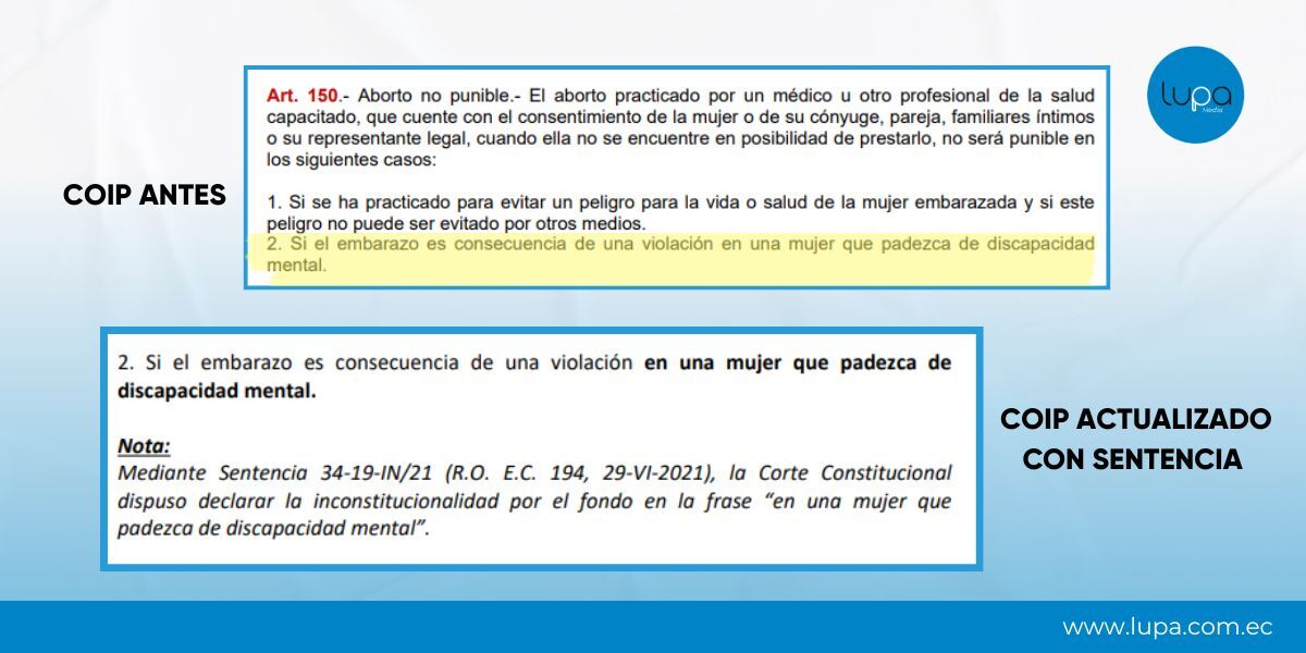 En abril de 2021, mediante la Sentencia No. 34-19-IN/21, la Corte declaró inconstitucional la restricción que permitía el aborto por violación solo a mujeres con discapacidad mental. La decisión garantizó el acceso a esta práctica, sin sanción penal, a todas las mujeres víctimas de violación, independientemente de su condición mental.
