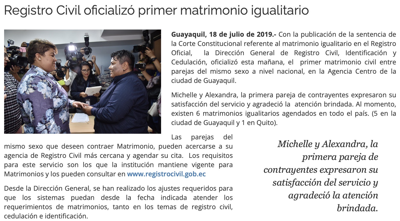 El 18 de julio de 2019, tras publicarse la sentencia en el Registro Oficial, se celebró en Guayaquil el primer matrimonio igualitario del país.