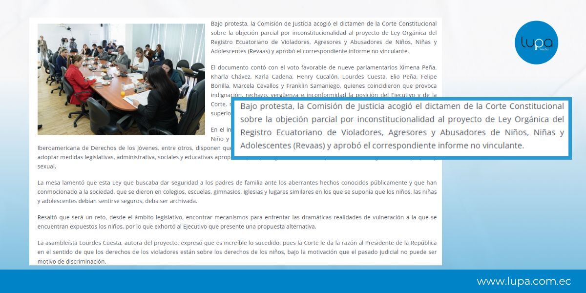 En diciembre de 2019, la Corte Constitucional (Sentencia No. 5-19-OP/19) declaró inconstitucional el proyecto de ley que creaba el Registro Ecuatoriano de Violadores, Abusadores y Agresores Sexuales (REVAAS). La propuesta, parcialmente vetada por el presidente Lenín Moreno, contemplaba un registro público de condenados por delitos sexuales contra menores y les prohibía trabajar con ellos.