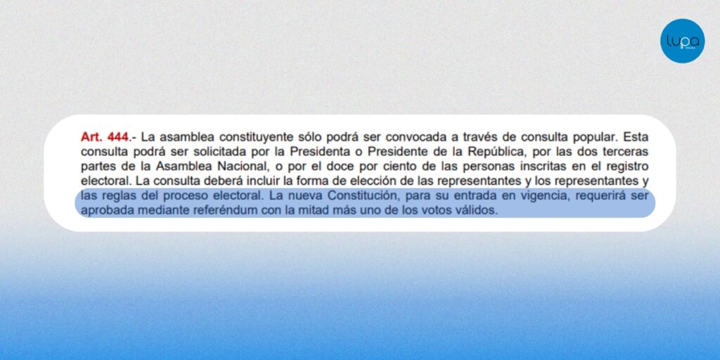 Si en estas votaciones se aprueba convocar e instalar una Asamblea Constituyente para elaborar una nueva Constitución, esta deberá ser ratificada en referéndum con la mayoría absoluta de votos válidos (mitad más uno) para entrar en vigor. Así ocurrió con la Constitución de 2008, que fue aprobada por el 64% de los votantes el 28 de septiembre de 2008 en consulta popular.