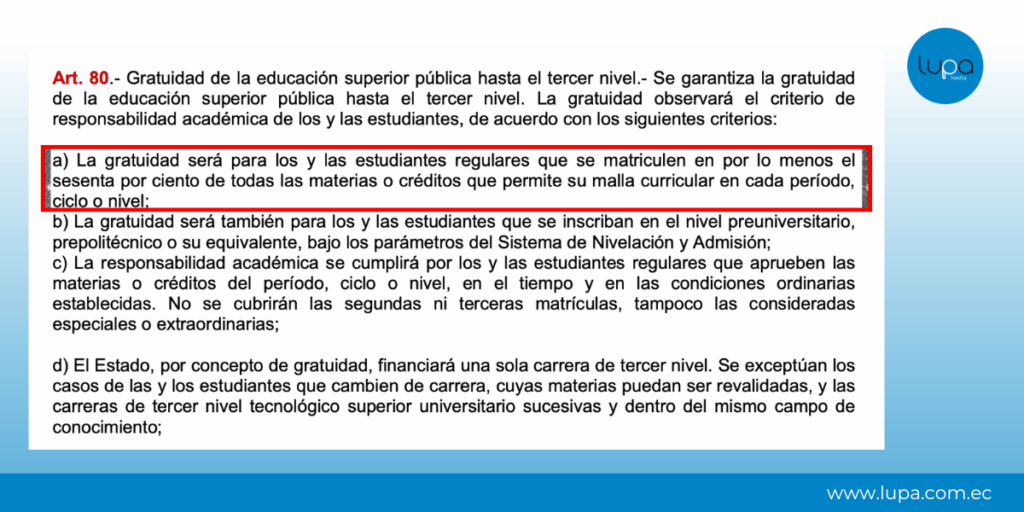 La Ley Orgánica de Educación Superior (LOES), también determina que es responsabilidad del Estado garantizar la gratuidad para quienes se matriculen en al menos el 60% de las materias o créditos de su malla curricular cada ciclo.