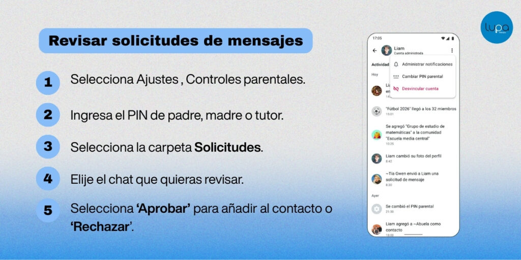 - si una persona desconocida envía un mensaje, este queda en una carpeta de solicitudes que el adulto debe revisar y aprobar.
