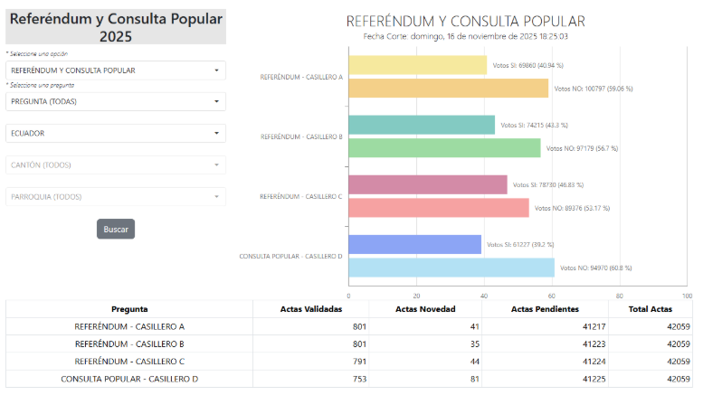 Aún no existen resultados preliminares ni oficiales del Referéndum y Consulta Popular 2025. Además, el vocal del CNE, José Cabrera, aclaró que durante esta jornada electoral no habrá exit polls (encuestas a boca de urna).