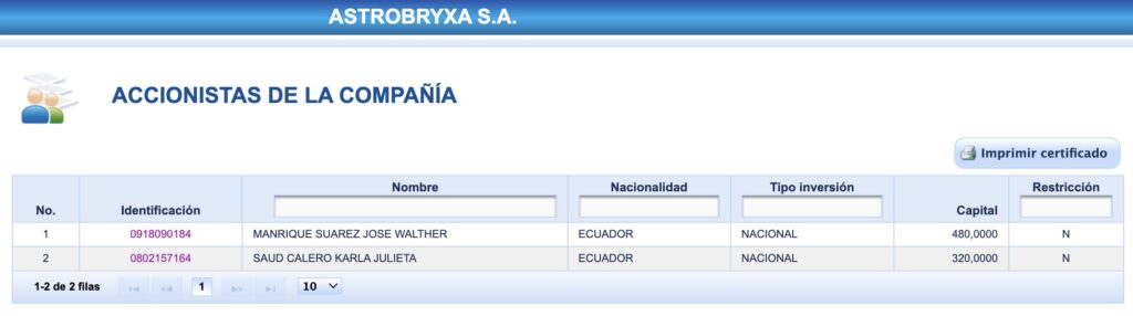 El documento judicial también menciona posibles vínculos personales entre personas asociadas a la empresa subcontratada y exfuncionarios del sector eléctrico. En ese contexto, se hace referencia a Karla Saud Calero, quien figura como accionista de Astrobryxa junto con José Manrique Suárez, según registros de la Superintendencia de Compañías. Saud Calero tiene una relación familiar con Fabián Calero, quien se desempeñaba como gerente general de CELEC al momento de la adjudicación de los contratos. Asimismo, el escrito judicial indica que Fabián Calero salió del país y que se desconoce su paradero.