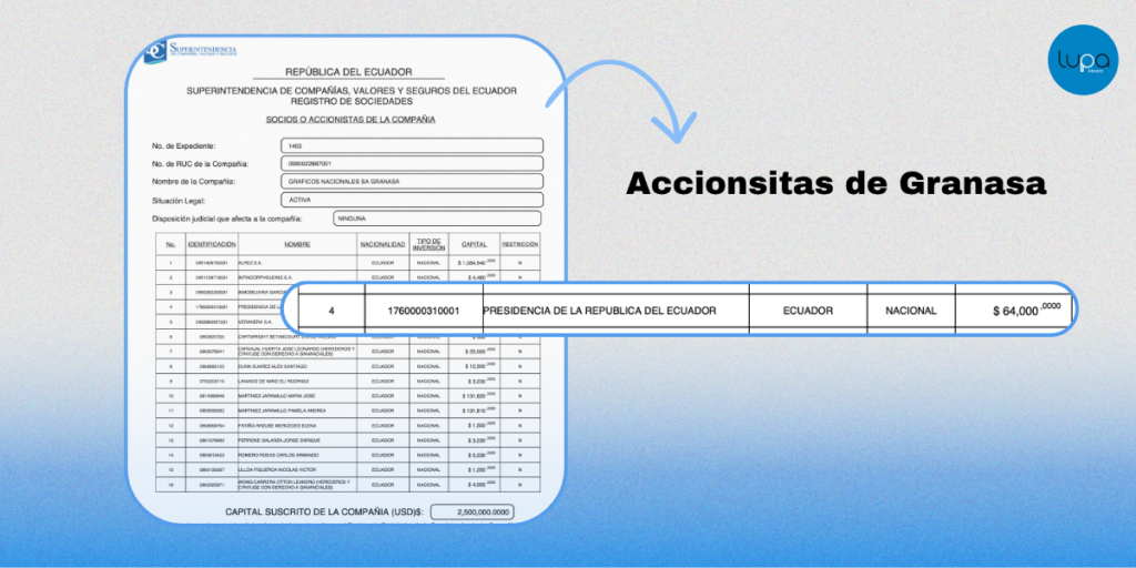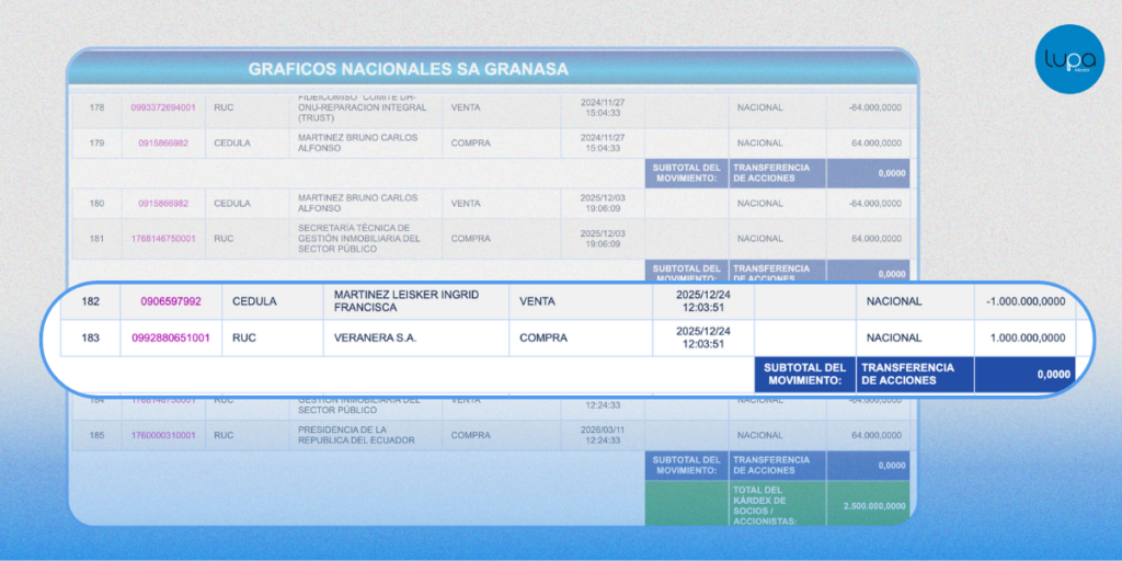 Según la empresa, estas acciones pertenecían a la compañía Veranera y fueron transferidas en 2020 a Ingrid Martínez Leisker. Sin embargo, la Superintendencia de Compañías cuestiona la validez de esa operación por falta de trazabilidad.