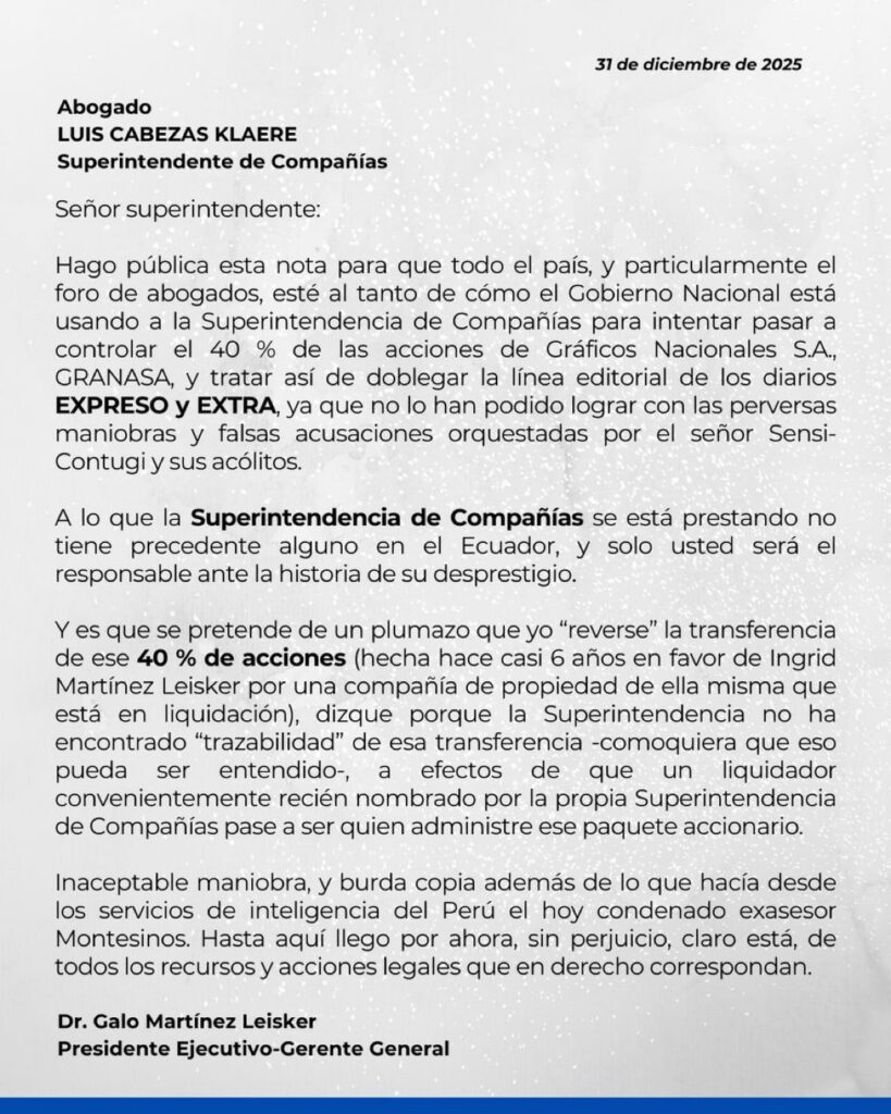 En diciembre de 2025, el presidente ejecutivo de Granasa, Galo Martínez Leisker, afirmó que el Gobierno buscaba influir en la empresa a través de la Superintendencia de Compañías.