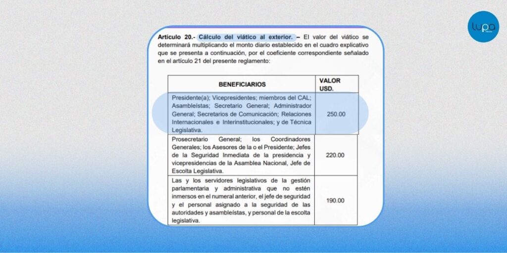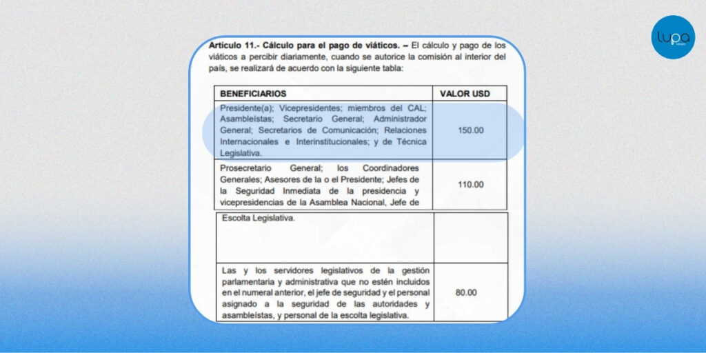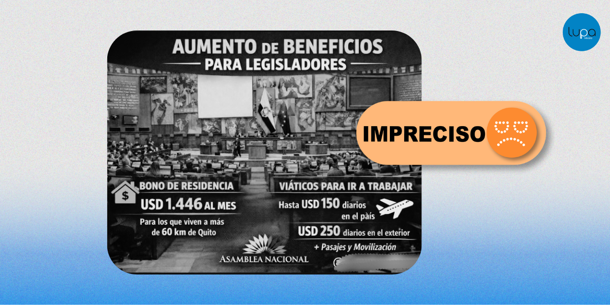 Una publicación viral afirma que la «Asamblea Nacional actualizó su reglamento y aumentó los beneficios de sus legisladores». Según el contenido difundido, el bono de residencia subió a USD 1.446 mensuales para quienes viven a más de 60 km de Quito, y los viáticos alcanzan USD 150 diarios en el país y USD 250 en el exterior, más pasajes y movilización.