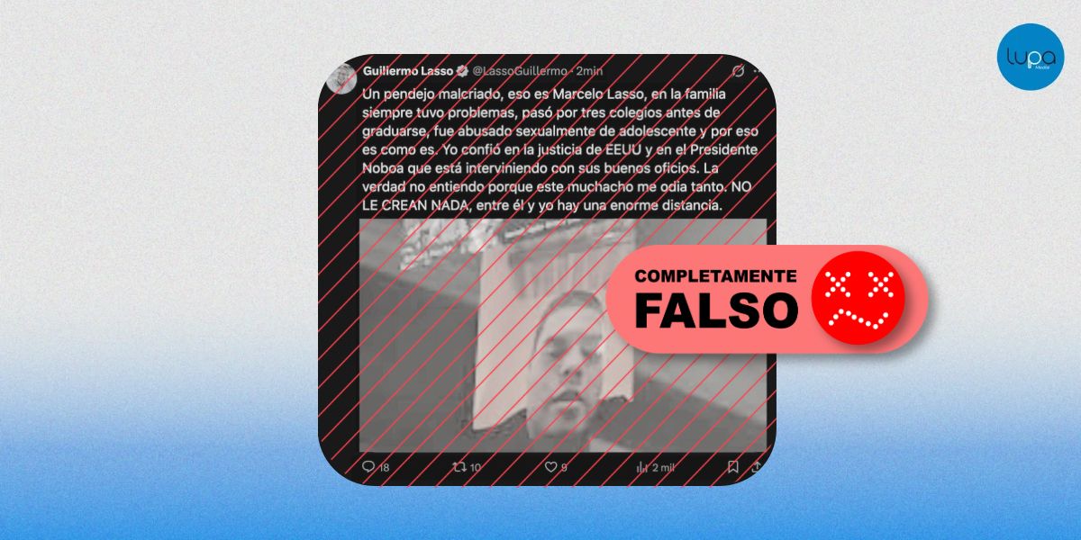 COMPLETAMENTE FALSO: No existe evidencia de que Guillermo Lasso haya publicado el tuit atribuido, no aparece en su cuenta oficial, tampoco tiene huella digital o registro en archivos web. El equipo del expresidente confirmó a Lupa Media que el contenido es falso y que no existe algún vínculo personal o familiar con Marcelo Lasso. Además, el contenido posee inconsistencias gráficas que evidencian que se trata de un contenido fabricado.