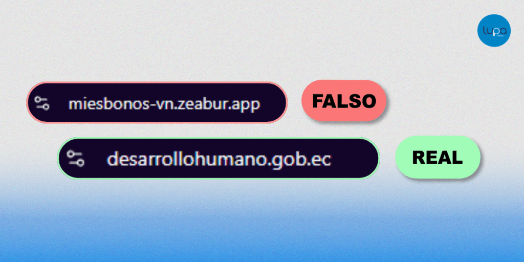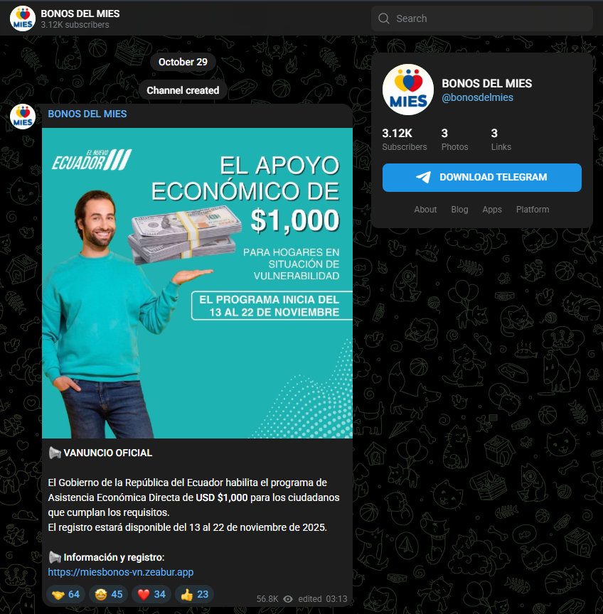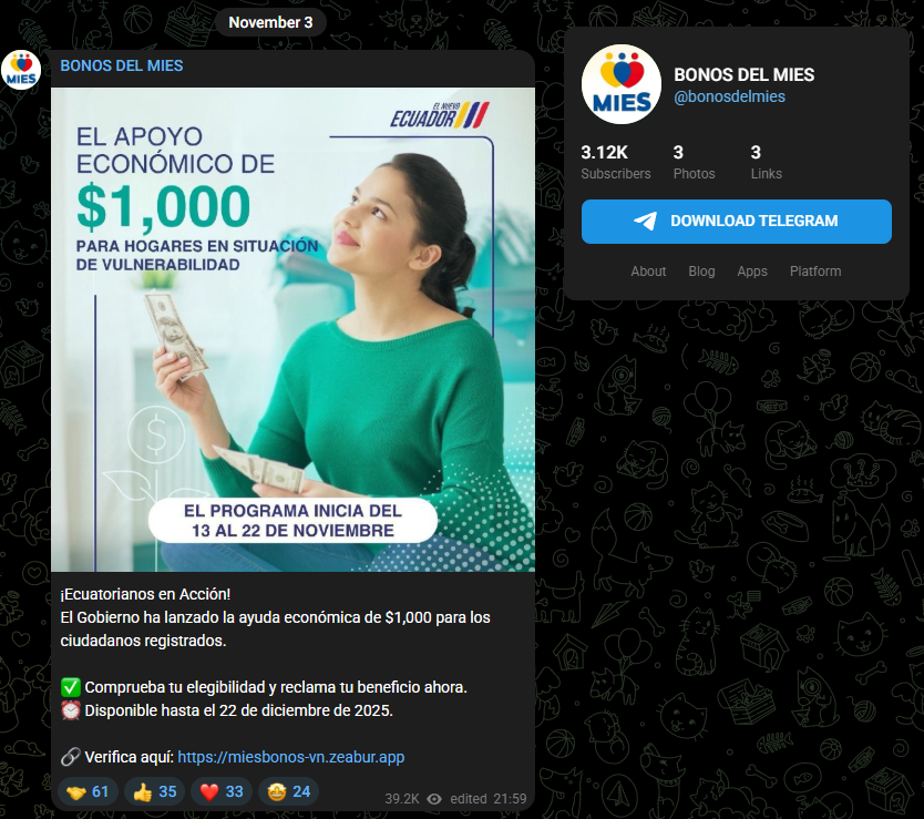Aunque no forman parte de la desinformación electoral, durante el periodo de campaña detectamos un aumento significativo de estafas digitales basadas en supuestos bonos, ayudas económicas o transferencias estatales. Estos contenidos circularon con fuerza en WhatsApp, Telegram y TikTok, muchas veces desde cuentas recién creadas o que suplantaban la identidad de instituciones públicas y del presidente Noboa.
