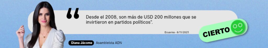 De acuerdo con datos del Consejo Nacional Electoral (CNE) y la Asamblea Nacional, desde 2008 el Estado ha destinado alrededor de USD 240 millones para financiar a las organizaciones políticas: USD 81 millones mediante el Fondo Partidario Permanente y USD 160 millones para la promoción electoral durante elecciones.