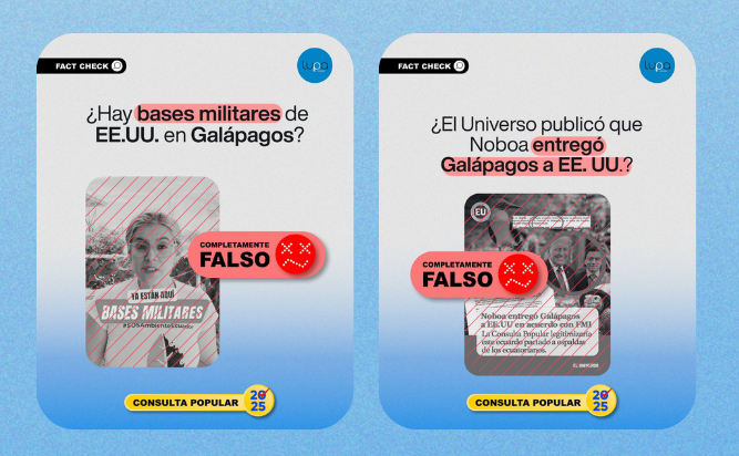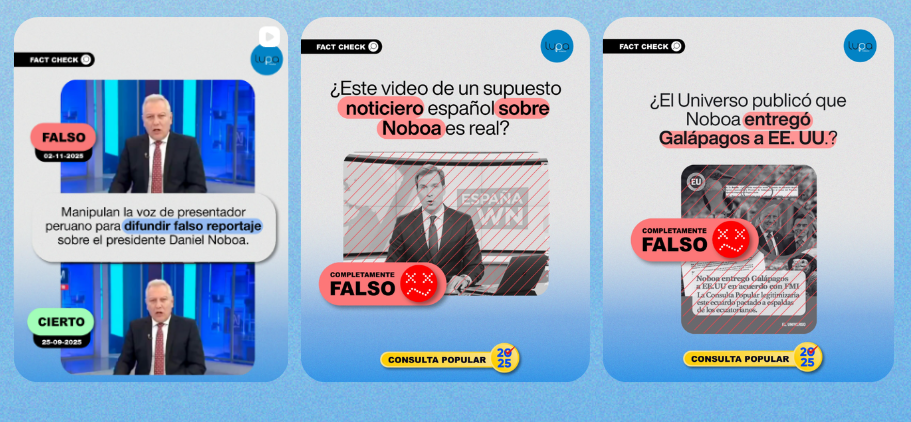 Los desinformadores repitieron estrategias vistas en procesos anteriores, como los deepfakes de noticieros internacionales para posicionar mensajes que supuestamente “los medios locales no muestran”, y la usurpación de identidad de medios ecuatorianos para difundir contenido falso con apariencia de legitimidad.