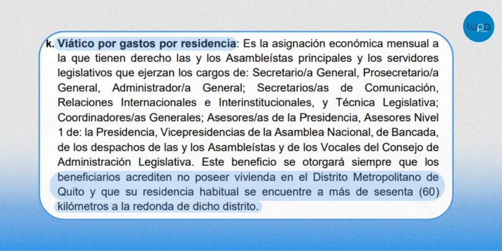 - La compensación por gastos de residencia para legisladores con domicilio a más de 60 km de Quito está contemplada en la normativa de la Asamblea desde el período 2009. También figuraba en el artículo 64 del Reglamento Interno de Administración del Talento Humano aprobado el 31 de diciembre de 2024.