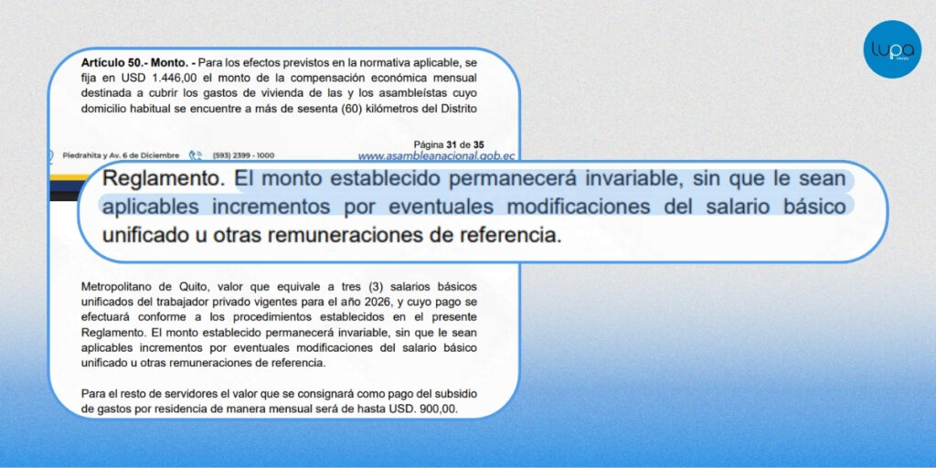 La publicación viral indica cambios recientes en los beneficios de los legisladores, pero la compensación por residencia a más de 60 km de Quito existe desde 2009. Para 2026, el monto es de USD 1.446, calculado como tres salarios básicos unificados y actualizado de acuerdo con el salario básico de cada año. El reglamento aprobado en 2026 centraliza estas disposiciones y fija el valor, evitando que siga aumentando con futuros ajustes del salario básico.