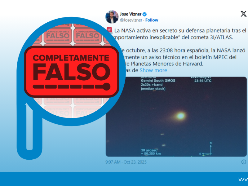 COMPLETAMENTE FALSO: El post viral en X que afirma que la Administración Nacional de Aeronáutica y el Espacio (NASA) activa “en secreto” su defensa planetaria tras el “comportamiento inexplicable” del cometa 3I/ATLAS es FALSO. La NASA no activó ningún protocolo secreto de defensa planetaria. El boletín del Minor Planet Center es un documento público y rutinario. El cometa 3I/ATLAS pasará a 270 millones de kilómetros de la Tierra, sin representar ningún peligro.