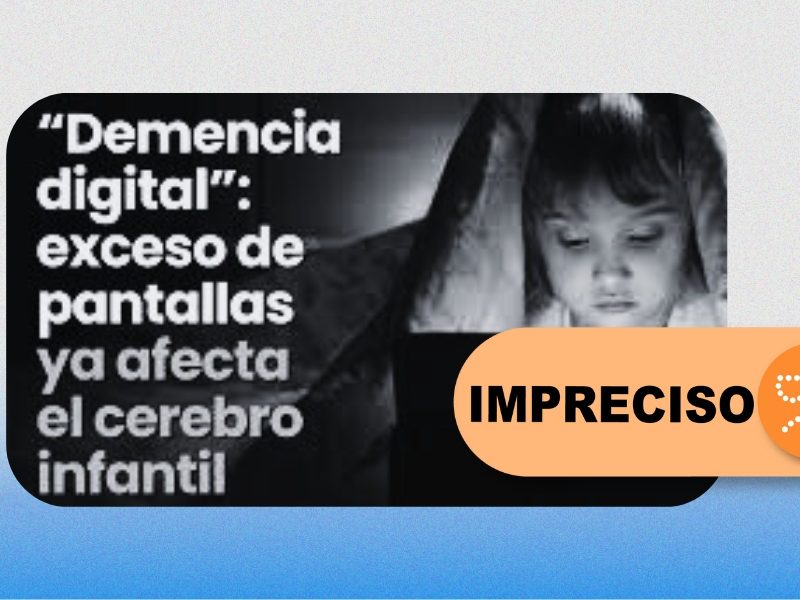 La afirmación mezcla hallazgos reales con una conclusión que no está respaldada por la evidencia científica. Múltiples estudios vinculan el uso excesivo de pantallas con dificultades en la atención, la memoria y la interacción social durante la infancia. Sin embargo, estos efectos no cumplen los criterios clínicos de una demencia ni implican daño cerebral irreversible. Además, no hay consenso médico que reconozca el término ‘demencia digital’ como un diagnóstico. Presentarlos como una enfermedad neurodegenerativa distorsiona el alcance de la evidencia disponible.