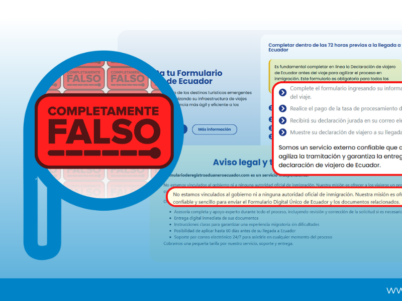 Una página fraudulenta cobra USD 22 por realizar el Formulario de Registro Aduanero (FRA) de Ecuador, cuando este servicio es completamente gratuito. El Servicio Nacional de Aduanas de Ecuador (SNAE) confirmó que se trata de una estafa digital.