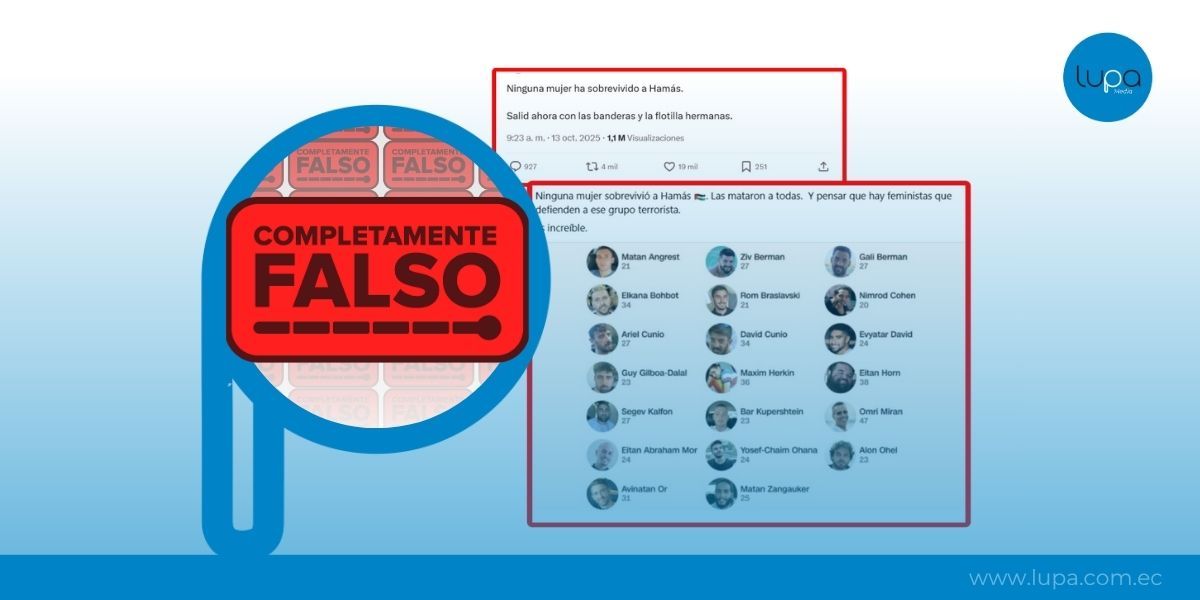 Publicaciones en redes sociales aseguran que «ninguna mujer secuestrada por Hamás ha sobrevivido» porque los 20 rehenes liberados el 13 de octubre de 2025 en el marco del alto el fuego eran hombres. Algunas cuentas políticas en X afirmaron que «Hamás asesinó a las rehenes mujeres restantes».