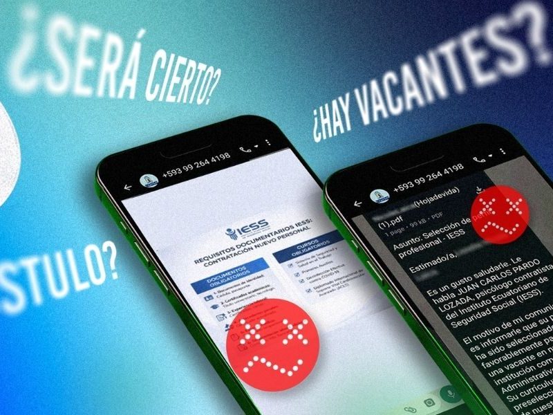 El punto de partida es casi siempre el mismo: una oferta laboral que promete estabilidad, buen sueldo y contratación inmediata. El mensaje llega por WhatsApp y asegura que hay vacantes disponibles en el Instituto Ecuatoriano de Seguridad Social (IESS). Un supuesto reclutador confirma que la persona fue elegida tras revisar su hoja de vida en plataformas oficiales y que su perfil fue validado por el área de talento humano. Sin embargo, este tipo de procesos no funcionan de esa manera.