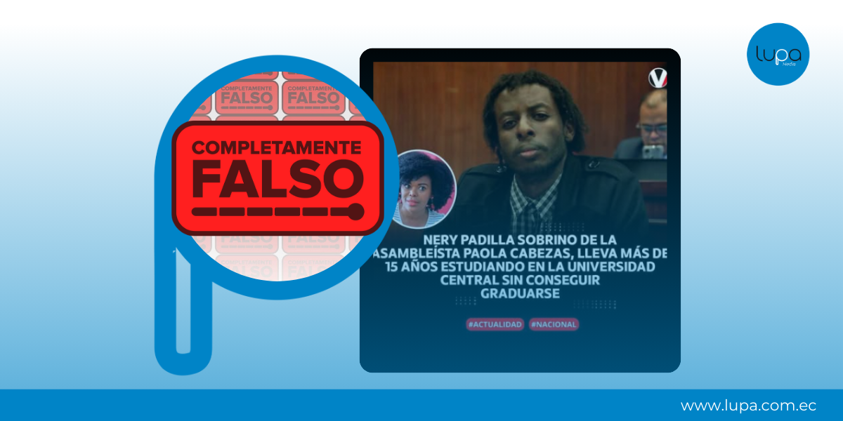 Una imagen que simula ser una portada de revista Vistazo circula en redes sociales afirmando que Nery Padilla, presidente de la Federación de Estudiantes Universitarios del Ecuador (FEUE), es sobrino de la asambleísta Paola Cabezas, del movimiento Revolución Ciudadana.