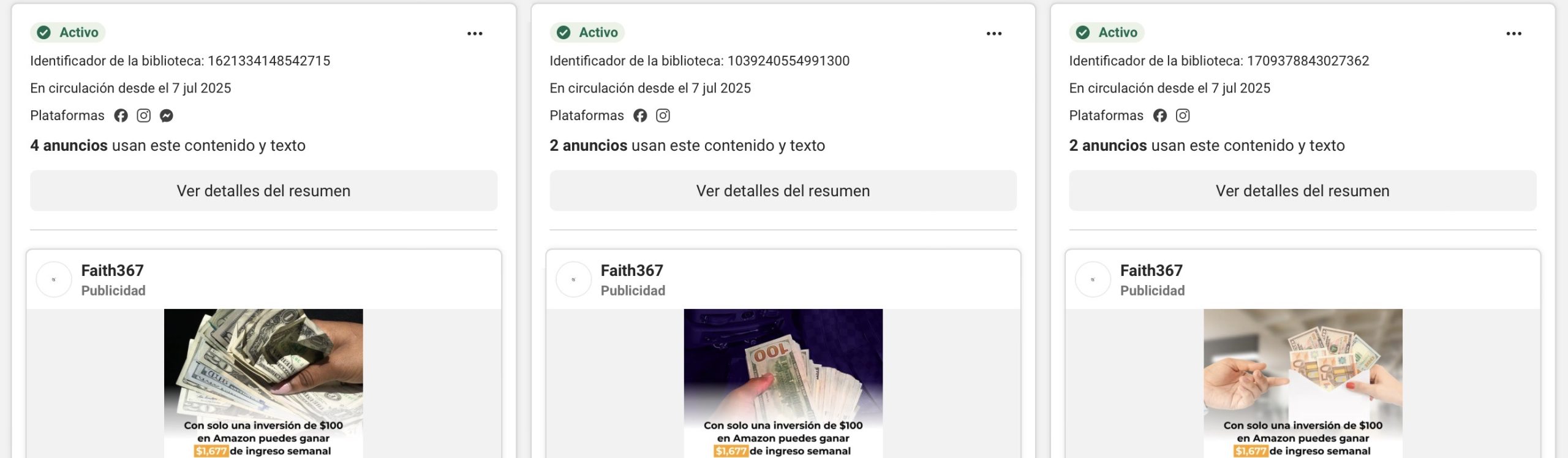 - Una página categorizada como “bienes raíces” creada en octubre de 2024, con 4 anuncios activos desde julio de 2025 relacionados con Amazon.