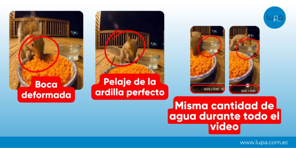 COMPLETAMENTE FALSO: El video viral que muestra a una ardilla comiendo fideos picantes y gritando fue generado con inteligencia artificial. Las ardillas no imitan voces humanas; solo emiten chillidos y chirridos para comunicarse o alertar sobre peligro.