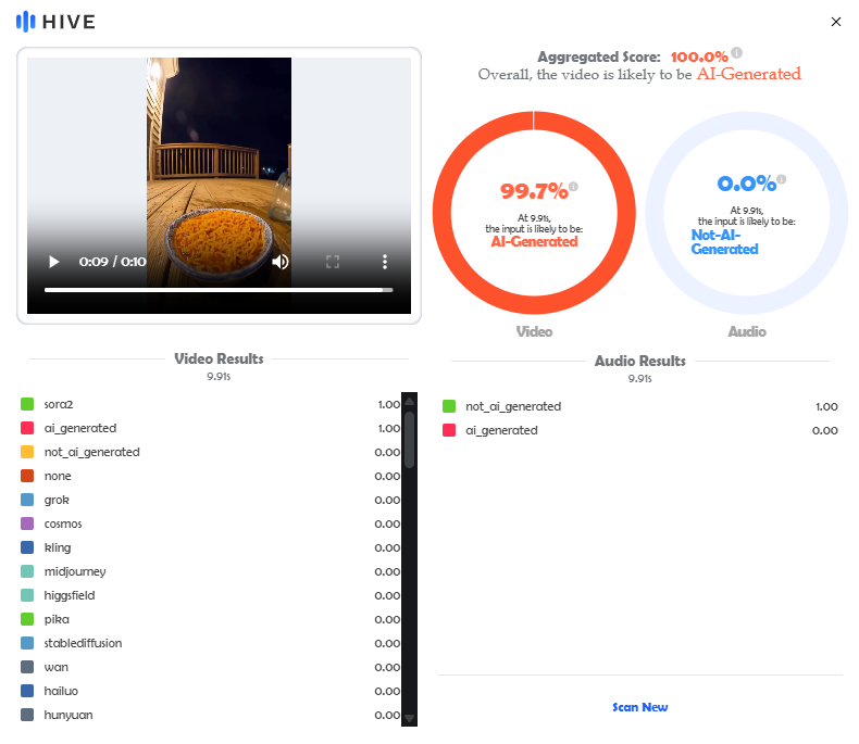 - Hive Moderation detectó un 99.7% de probabilidad de que este video haya sido creado con IA