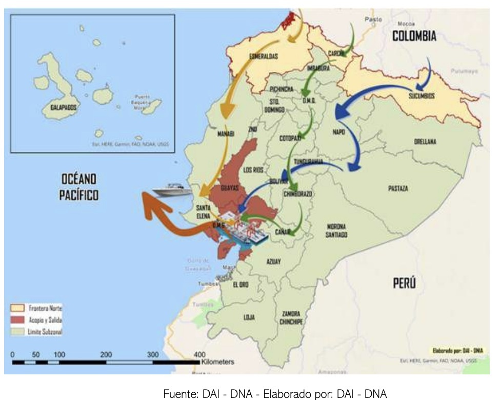 - Reportes oficiales confirman tres rutas: Un informe de evaluación del narcotráfico en Ecuador entre 2019 y 2022, elaborado por la Policía Nacional y el Observatorio Ecuatoriano de Crimen Organizado, establece tres rutas relacionadas con el transporte de cocaína hacia los principales puertos marítimos del país:
