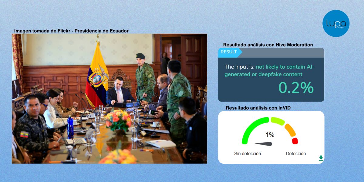 - Las fotografías del Consejo de Seguridad fueron descargadas del repositorio oficial de la Presidencia y analizadas con Hive, InVID y SynthID.