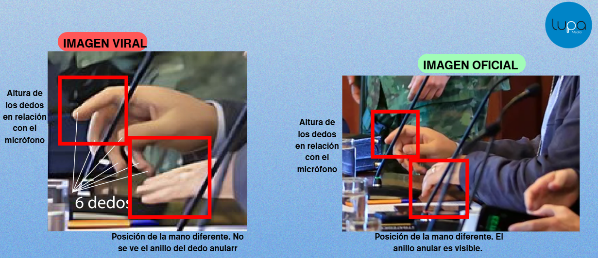 - Se aprecia difuminación irregular en uñas y contornos, ausente en la fotografía publicada por la Presidencia.