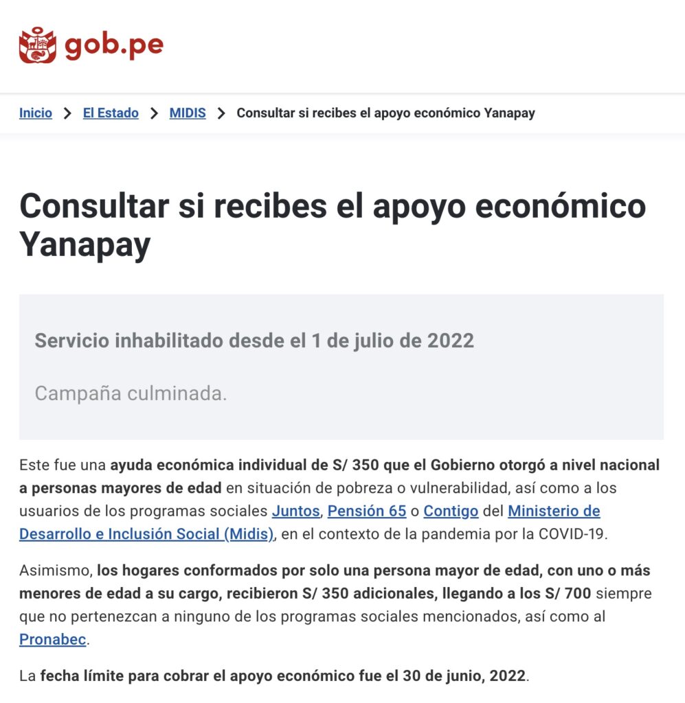 Gobierno de Perú – Consultar si recibes el apoyo económico Yanapay